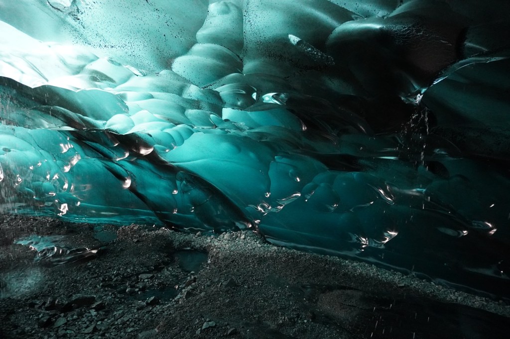 At the end of the climb, we were rewarded with one of the most stunning ice caves we’ve ever seen. Surrounded by glowing blue walls of ice, we stood in complete awe. Despite the cold, the experience was magical and unforgettable.