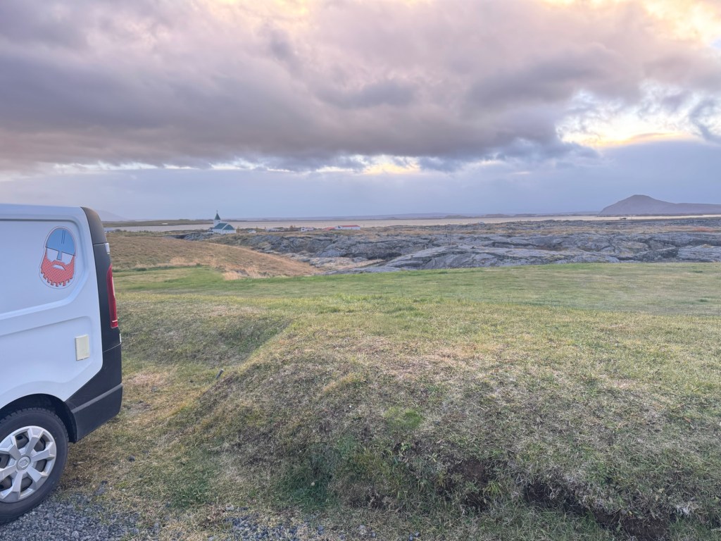 A few more scenic stops later, we arrived at our campsite, perched above an old church nestled within the lava fields, right on the edge of a lake with stunning mountains in the background. It couldn’t have been more picturesque.